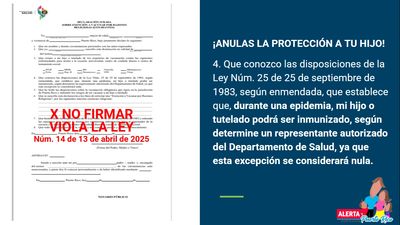 “Artículo 5. – No se requerirá́ el certificado de inmunización para admisión o matrícula de aquel estudiante o niño preescolar que presente una declaración jurada de que él o sus padres pertenecen a una organización religiosa cuyos dogmas confligen con la inmunización o de que él o sus padres tienen sinceras creencias o convicciones religiosas que están en conflicto con la inmunización. Igualmente, no se requerirá́ certificado de inmunización de aquel estudiante o niño pre-escolar que presente una certificación firmada por un médico autorizado a ejercer la profesión en Puerto Rico a los efectos de que una o más de las inmunizaciones requeridas por el Secretario de Salud pueden ser detrimentales para la salud del estudiante. El certificado deberá́ indicar la razón específica y la posible duración de las condiciones o circunstancias contraindicadas de la inmunización. Todo estudiante o niño preescolar quedará exento de inmunizarse de aquellas enfermedades que haya padecido. Esto se acreditará mediante el correspondiente certificado médico o declaración jurada del estudiante, o del padre, madre o tutor. Los(as) estudiantes exentos de las disposiciones de esta Ley no podrán ser vacunados(as) durante una epidemia, sin el consentimiento informado por escrito del padre, madre o tutor(a) legal. Las protecciones constitucionales de libertad religiosa no serán condicionadas a recibir ayuda estatal o federal para cursar estudios en las escuelas o colegios de Puerto Rico. El estado no podrá imponer sanciones que incluyan multas o cárcel a ningún padre, madre o tutor(a) legal a base de su libertad religiosa que decida no vacunar a sus hijos(as).